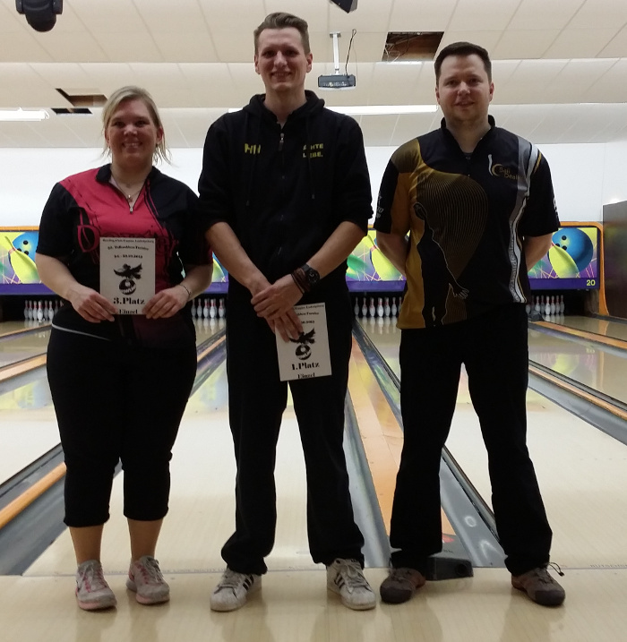Spielern Kevin Frank, Marcel Kraft und Daniel Friesch durch 2587 Pins (Schnitt 215,6). 10 Pins dahinter mit 2574 Pins das bayrische Trio „TaMaSa“ mit Tanja Theissen, Sabrina Laub (BV 68 Regensburg) und Martin Knöbl (BV Unterföhring). Diese begannen im ersten Gang mit 721 Pins (Tanja Theisen / Sabrina Laub je 248 Pins, Martin Knöbl 225 Pins) konnten diese hohen Durchgänge jedoch nicht wiederholen. Auf Platz 5 das Trio „Freilos“ mit Oliver Pescher (BC 99 Ingelheim), Pascal Winternheimer (BSV Kassel) und Tobias Börding (BV 68 Regensburg). Platz 6 erreichten die Sieger von 2014 „die drei Umdrehungen“ mit Nadine Geißler (Inter Mannheim), Jürgen Neumann (BSV Koblenz) und Christian Haas (TSV Mannheim). Platz 7 ging an das Trio „Mixery“ mit Natascha Kögler, Manuel Pflügl (beide BKSV Stuttgart-Nord) und Kai Günther (KFV Havelland) durch 2533 Pins. Platz 8 an „Pickup“ mit Dirk Völkel, David Canady (BSV Kassel), Marcel Bagemihl (KV Stuttgart) mit 2532 Pins. Dirk Völkel spielte dabei, ebenso wie Karsten Aust, 950 Pins das beste Einzelergebnis in der Trio-Runde. Auf Platz 9 folgten „BC Germania Mannheim“ mit Lukas Eder, Andreas Krätzig, Henry Parthenschlager (alle BSV Mannheim) 2511 Pins. Gefolgt von den zehnten mit 2486 Pins vom BSO Stuttgart „SNOP 2“ bestehend aus Oliver Plewnia, Sven Nicolussi und Oliver Panas.